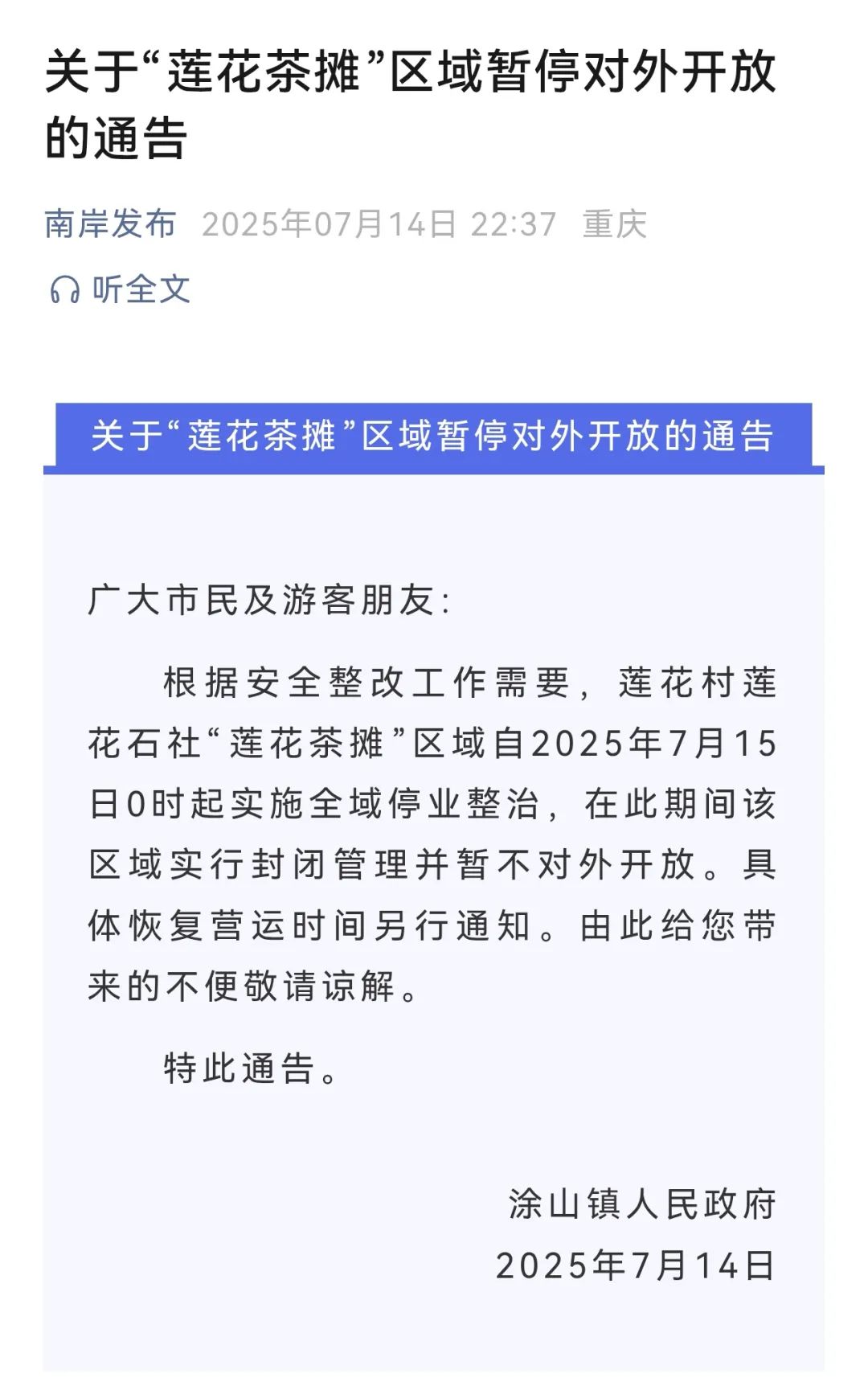 涂山镇发布“莲花茶摊”区域实施全域停业整治的通告。