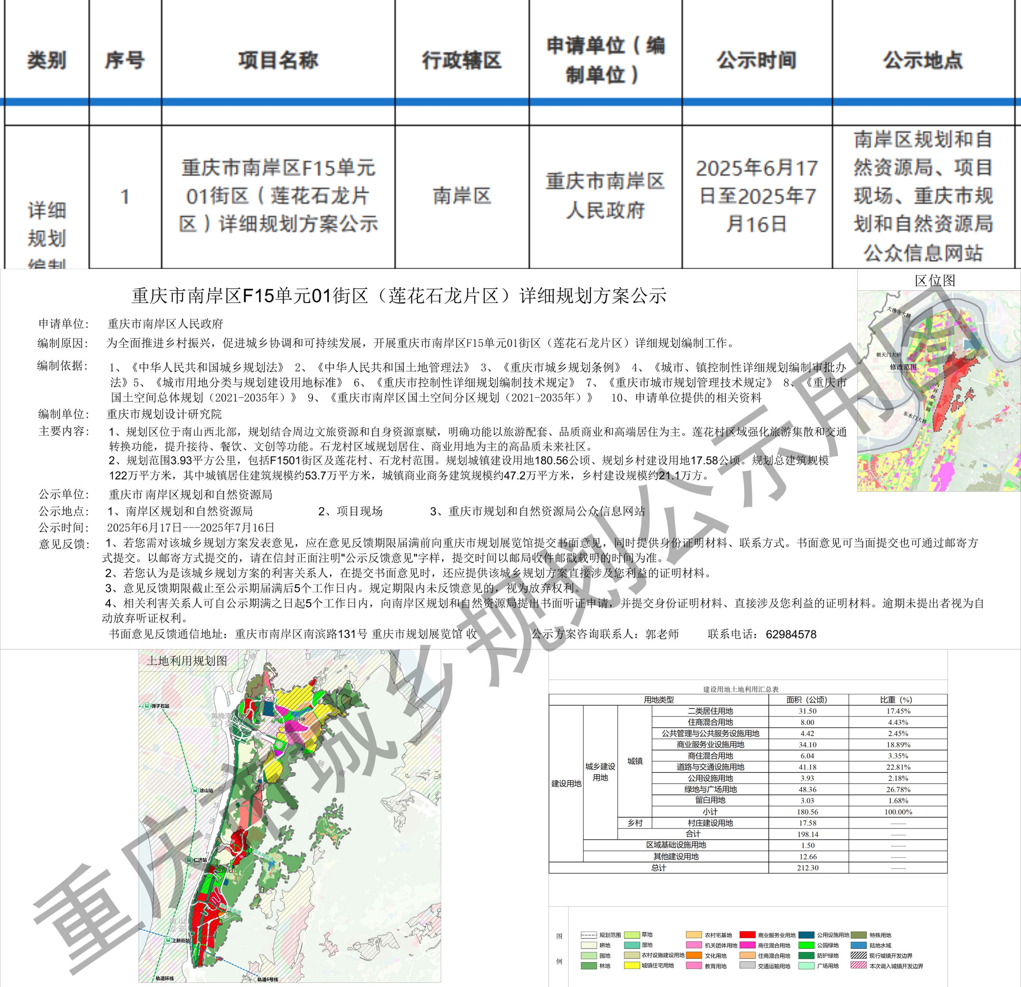 《重庆市南岸区F15单元01街区(莲花石龙片区)详细规划方案》公示内容。