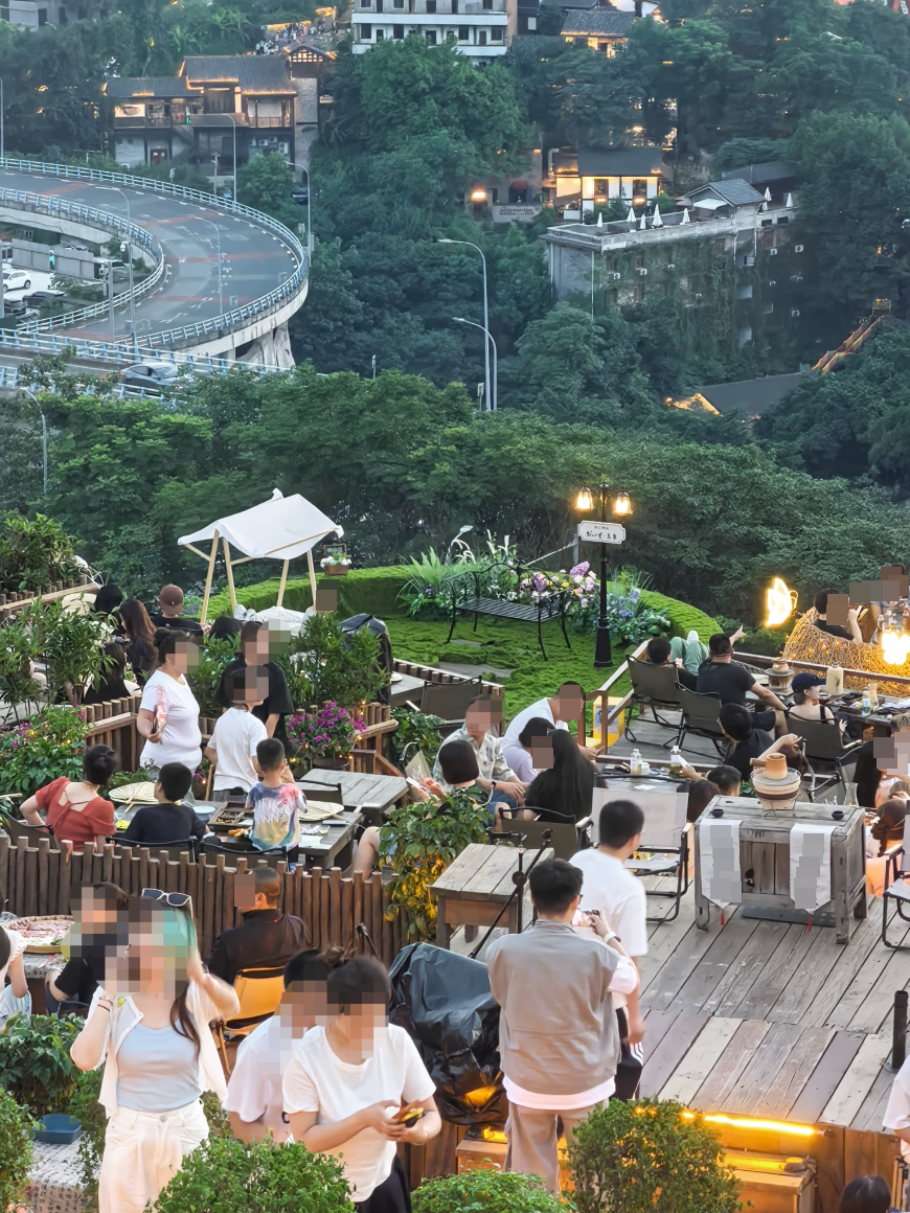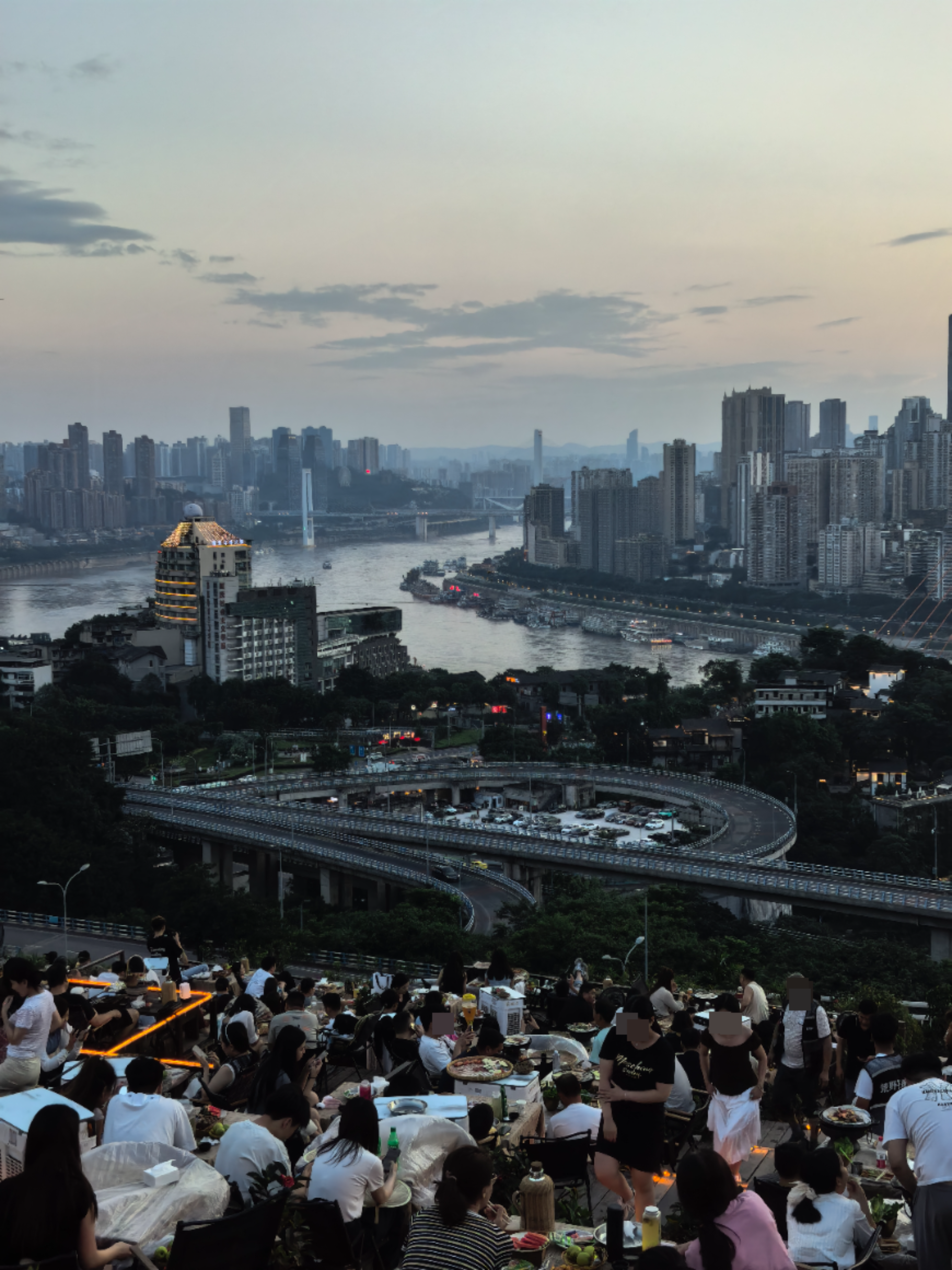 由于“莲花茶摊”区域可眺望横跨长江的东水门大桥,灯火璀璨的渝中半岛,以及观赏城市“日落”景色,因此,吸引着大量游客和市民前来打卡。